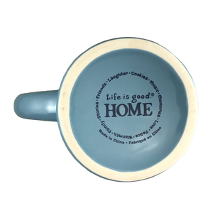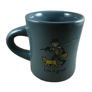 Printed on the back is an image of a man walking with a dog holding a fishing rod and tackle box, "Life is good" is printed below this.