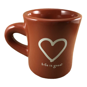On the rear surface is a white heart outline with "Life is good!" printed beneath it in a white font.