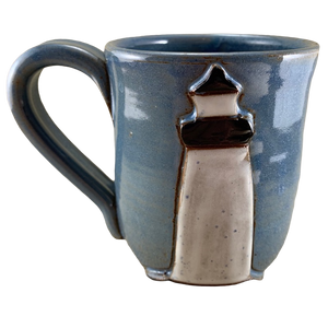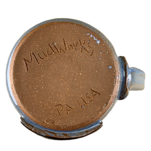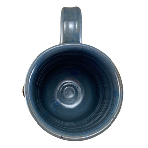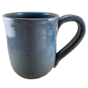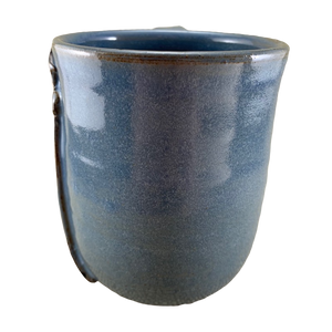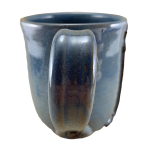 This is a hand thrown mug with a beautiful finish in shades of blue mixed with a bit of brown.