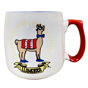 Features the same artwork on its front and rear surface depicting a llama with a flag draped on its back.