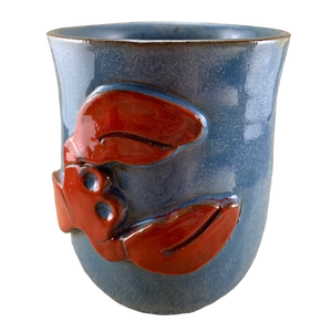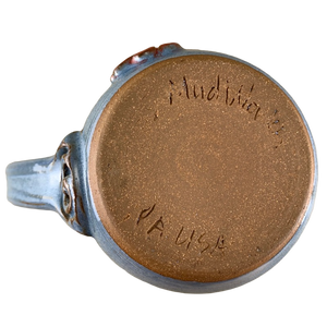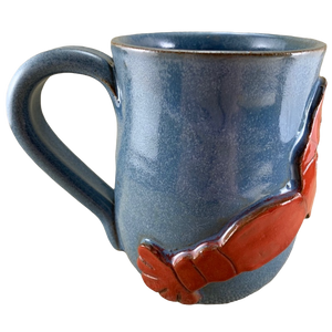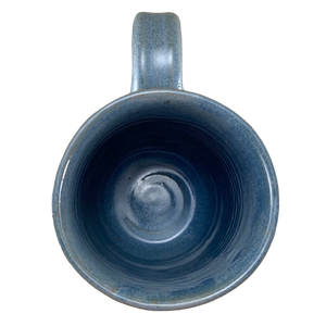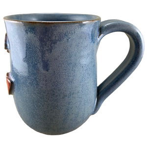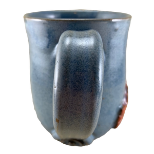 This is a hand thrown mug with a beautiful finish in shades of blue mixed with a bit of brown.
