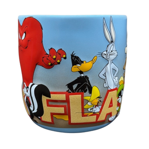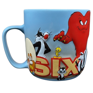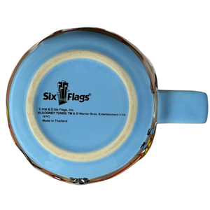 This mug showcases a collection of embossed Looney Tunes characters encircling its surface. Among the featured figures are Taz, Road Runner, Wiley E. Coyote, Marvin The Martian, Bugs Bunny, Speedy Gonzales, Daffy Duck, Pepe Le Pew, Tweety Bird, Pussyfoot, Gossamer, Sylvester, and Yosemite Sam. "SIX FLAGS" is embossed in a gold glitter font wrapping around the lower surface of the mug.