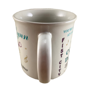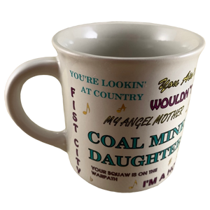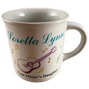 This is a super rare mug that features "Loretta Lynn" printed on its front upper surface in a blue cursive font.