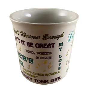 There are song titles by Loretta Lynn wrapping around its exterior surface and gold music notes scattered around the exterior surface surrounding the song titles.