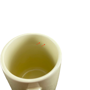 There is crazing on the interior and exterior surface. It is not extremely apparent until liquid is in the mug and then it becomes quite obvious. One of the crazing lines may be a hairline crack as it is visible from both the exterior and interior surface. Please see the red arrow on the left pointing to this in the last photo. The arrow to the right is pointing to a crazing line.