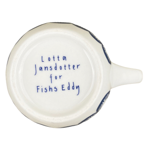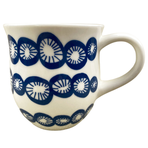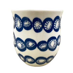 Features blue abstract ovals with blue lines inside them wrapping around its exterior surface.