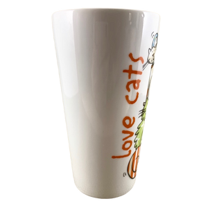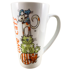 This is a much taller than average mug that features whimsical artwork depicting 4 cats standing on each other forming a cat statue.