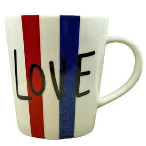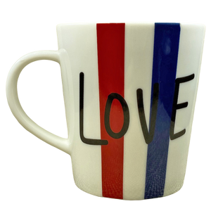 "LOVE" is printed on its front and rear surface in a black font with a red and blue vertical stripe behind it.