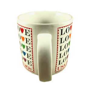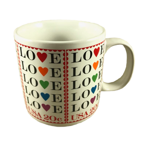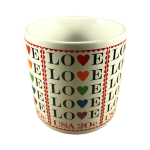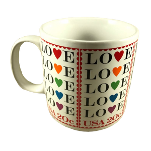 Features artwork which depicts a 20 cent stamp. The stamp says "LOVE" 5 times wth each "LOVE" stackedin a vertical column. The letter V in "LOVE" is a heart of different color on each line in the verticval column.