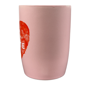 It features a three tone design in Pink, red, and white. Printed on the front surface in a white font on top of a read heart is: