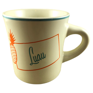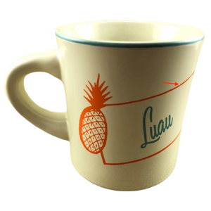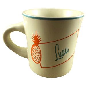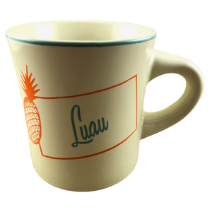 "Luau" is printed in a blue green cursive font to the right of the pineapple.