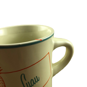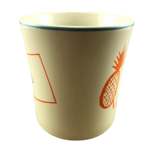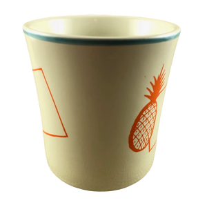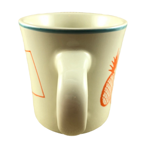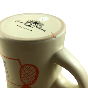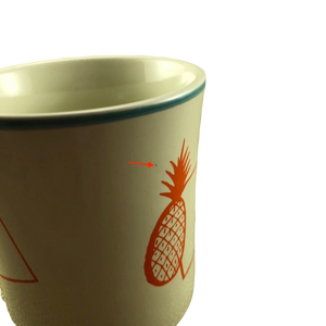 Copy 1: This mug has no cracks, scratches, stains or crazing. There are 2 tiny nicks present, one is in the trim ring on the front upper surface and the other is to the left of the pineapple on the front surface. Please see the red arrows pointing to these in the last 2 photos. There is a hint of wear on the bottom rim, please see the 6th photo. Overall this mug is in excellent condition.