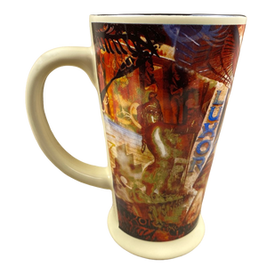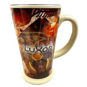 This tall mug features artwork wrapping around its exterior surface depicting various sights related to the Luxor Hotel in Las Vegas.