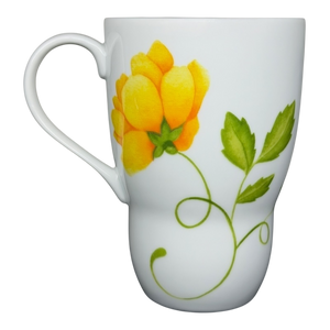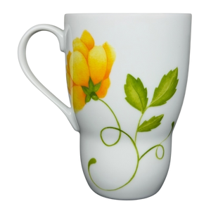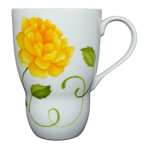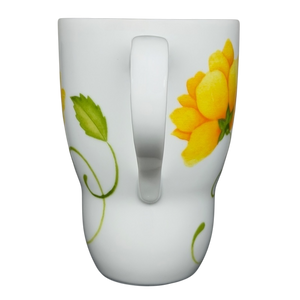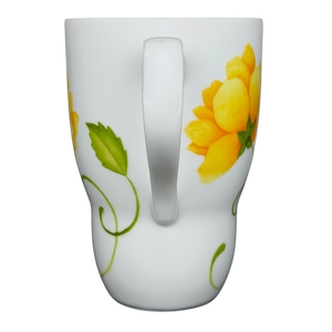 This Westbury Court ceramic mug features a warm and inviting floral design that immediately stands out through its rich yellow rose artwork and flowing green vines. The hand-painted appearance of the petals creates a soft, layered look, giving the flower depth and a natural vibrancy against the crisp white background. Each side of the mug showcases a different view of the rose and its leaves, allowing the design to wrap gracefully around the form.