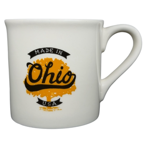 This Starbucks “Made in Ohio U.S.A.” mug features a soft cream-colored ceramic body inside and out, highlighted by a bold vintage-style Ohio graphic in warm yellow and black, with a vertical Starbucks logo placed opposite the handle for a clean, classic look. The gently flared rim, comfortable handle, and glossy cream interior make it ideal for everyday coffee or tea, while the sturdy diner-style form gives it a solid, substantial feel. Finished with a Starbucks bottom stamp noting a 14 oz capacity and Made in USA, this mug is a great collectible for Starbucks fans, state-themed mug collectors, or anyone with Ohio pride.