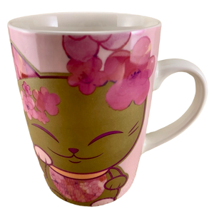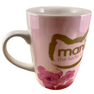 There are flowers on the rear surface and the outline of Mani's head above them with "mani the lucky cat" printed inside it.