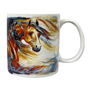 This beautiful mug features colorful artwork of horses wrapping around its exterior surface.