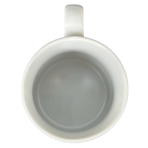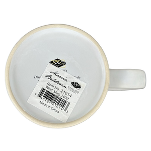 - This mug appears unused with its original sticker still on its bottom surface. The sticker has some creasing and sticky residue on it.