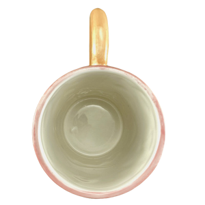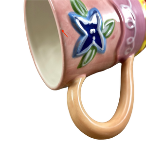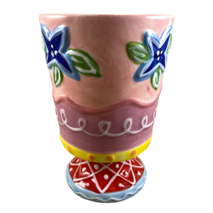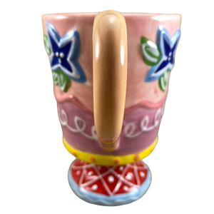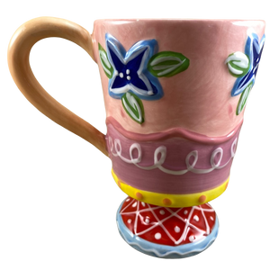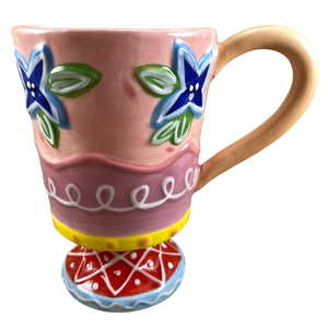 This mug features beautiful embossed flowers wrapping around its exterior surface and a pedestal base.