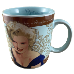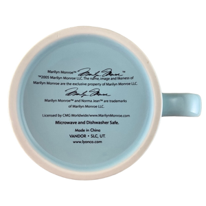 There are two bands of brown trim, one is wrapping around the upper surface under the rim, the other is wrapping around the lower surface near the base. Inside each of these bands are quotes in a cursive font from Marilyn Monroe.