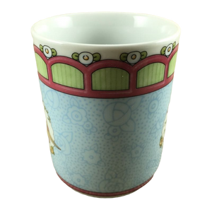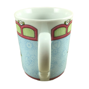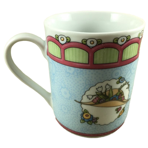 Wrapping around this mug is a blue background with subtle flowers throughout.