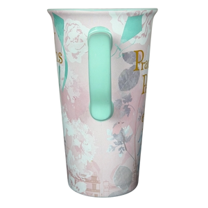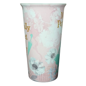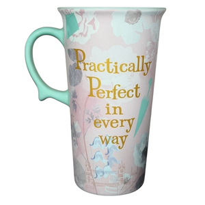 This elegant tall mug is inspired by the timeless charm of Mary Poppins, featuring soft pastel shades and delicate floral artwork wrapped around the entire design. One side showcases a graceful silhouette of Mary Poppins drifting through the clouds, while the other displays the iconic phrase “Practically Perfect in every way” in shimmering gold lettering. The mint-green handle and matching accents add a gentle pop of color, complementing the dreamy pink background filled with London scenery and illustrated umbrellas. With its refined shape and enchanting artwork, this mug brings a touch of magic to your daily routine.
