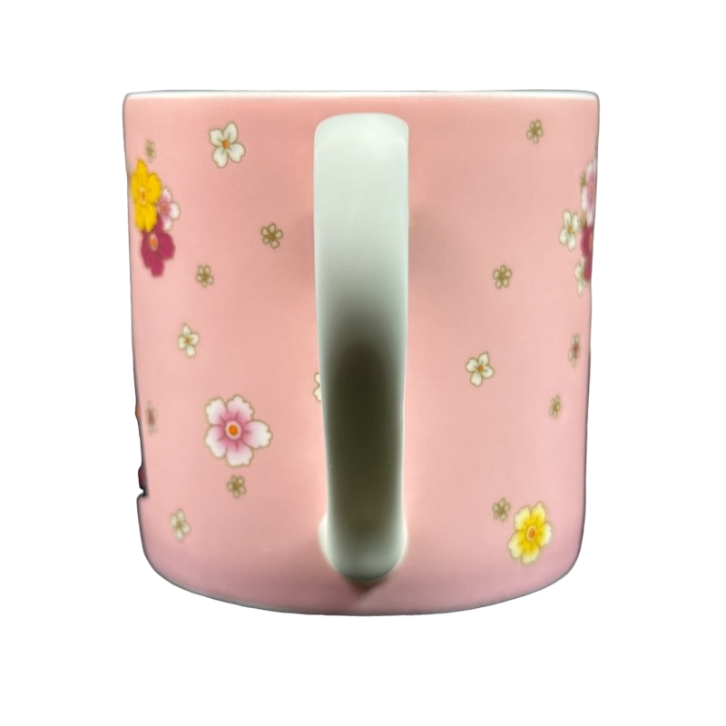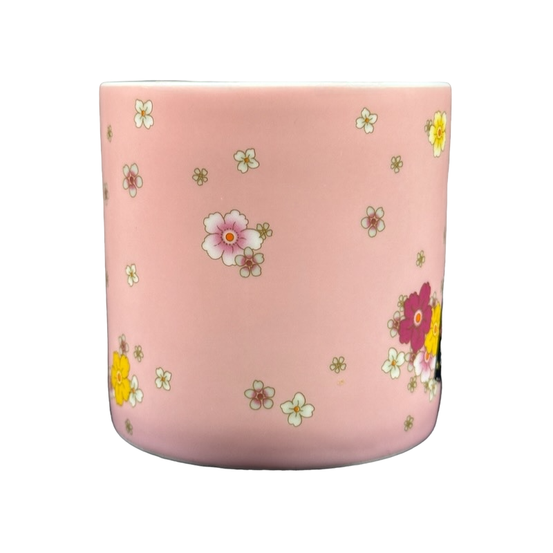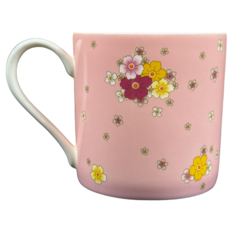 Wrapping around the entire exterior surface is a solid pink background with flowers scattered about in it.