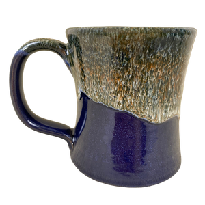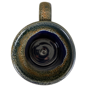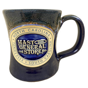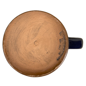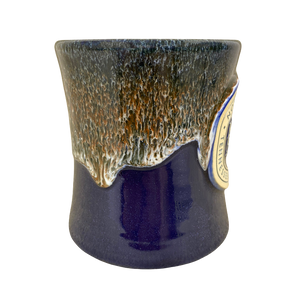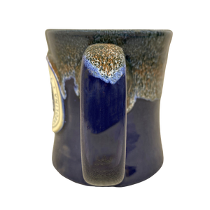 This is a beautiful hand thrown mug that features a raised etched plaque on its front surface that says the following: