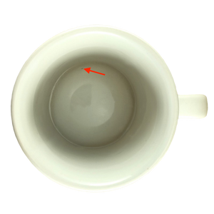 Condition note: there is a tiny scratch on the front surface, please see the red arrow pointing to this in the 1st photo. There are a few slightly dark dots on the bottom rim. Please see the last photo for a look at this. There is a small dark spot inside on the bottom surface, please see the red arrow pointing to this in the 5th photo.