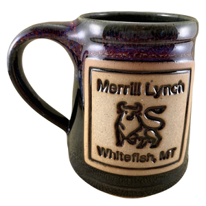 Also has a raised rectangular plaque on its front surface with a bull etched into its center. Etched above the bull is "Merrill Lynch" and below it is "Whitefish, MT."