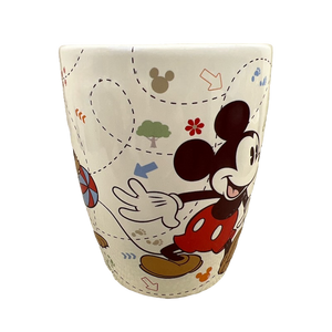 Features Mickey Mouse and Minnie Mouse dancing on its front surface which wraps around to the side opposite the handle.