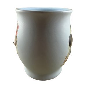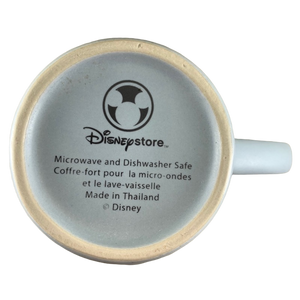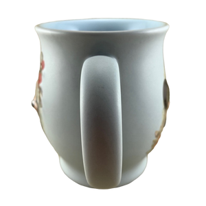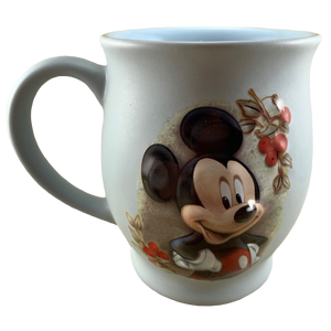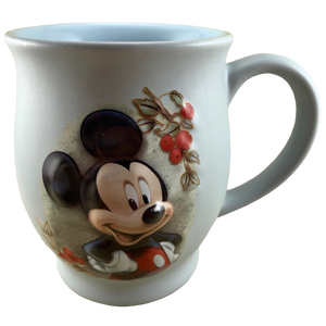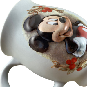 This mug features the same artwork on its front and rear surface consisting of an embossed Mickey Mouse surrounded by leaves and what appears to be red berries.