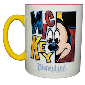 This Disney Parks mug features a clean white exterior with a bold, colorful Mickey graphic and stylized “MICKEY” lettering, paired with the classic Disneyland Resort logo beneath the artwork. Bright yellow accents on the handle add a playful pop of color, while the deep red interior creates a striking contrast that enhances the mug’s visual appeal. The simple cylindrical shape offers a comfortable grip and generous capacity for everyday coffee or tea, and the bottom stamp confirms official Disney Parks authenticity, making this a cheerful and collectible souvenir for Disneyland fans and Mickey enthusiasts alike.