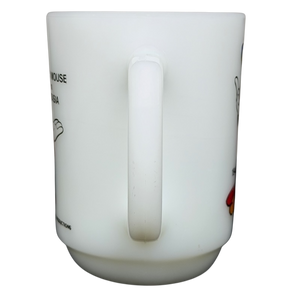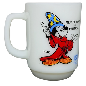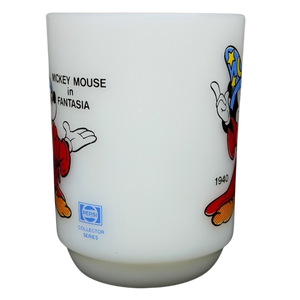 This vintage milk glass mug showcases Mickey Mouse in his iconic Sorcerer’s Apprentice outfit from Fantasia, featuring the classic artwork labeled “Mickey Mouse in Fantasia” with the year 1940 printed alongside the illustration. The bright white glass body highlights the vivid red robe, blue wizard hat with stars and crescent moon, and cheerful pose that captures the magic of Disney’s beloved animated classic. Designed as part of the Pepsi Collector Series, the mug has a sturdy straight-sided shape, comfortable handle, and timeless appeal that makes it a standout piece for Disney collectors, Fantasia fans, or anyone who appreciates nostalgic character mugs from the early collector series era.