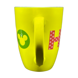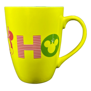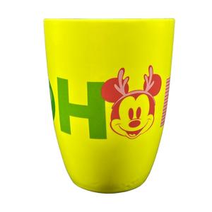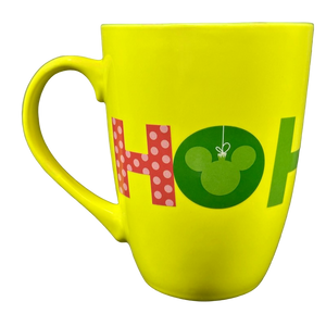 Wrapping around the whole exterior surface is "HO HO HO" printed in a large font. The letter O in the first and last HO is a Mickey Mouse Christmas ball. The letter O in the middle HO is Mickey Mouse wearing antlers.