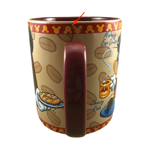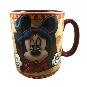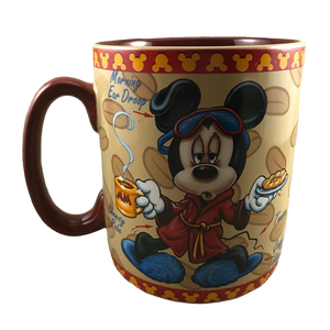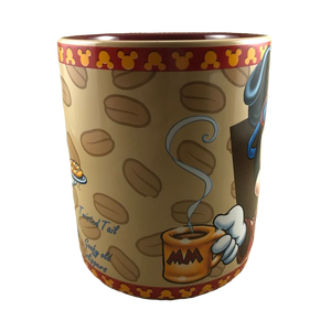Features an image of Mickey Mouse holding a cookie and a cup of coffee on the front and back.