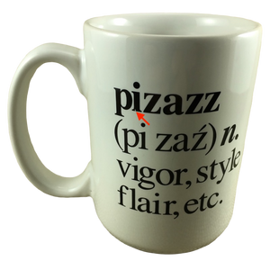 Condition note: there is a small nick on the bottom rim. Please see the red arrow pointing to this in the last photo. On the rear of the mug there is a tiny spot on the bottom of the letter i in pizazz where the black is missing. Please see the red arrow pointing to this in the 3rd photo.