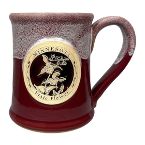 This is a pottery style mug that features a raised plaque on its front surface with an image of the Minnesota state flower, a Lady Slipper Orchid.