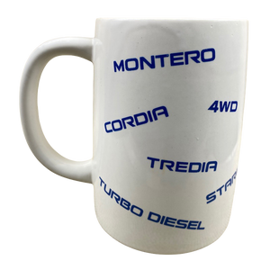 This mug features a large Mitsubishi Motors logo on its front surface.