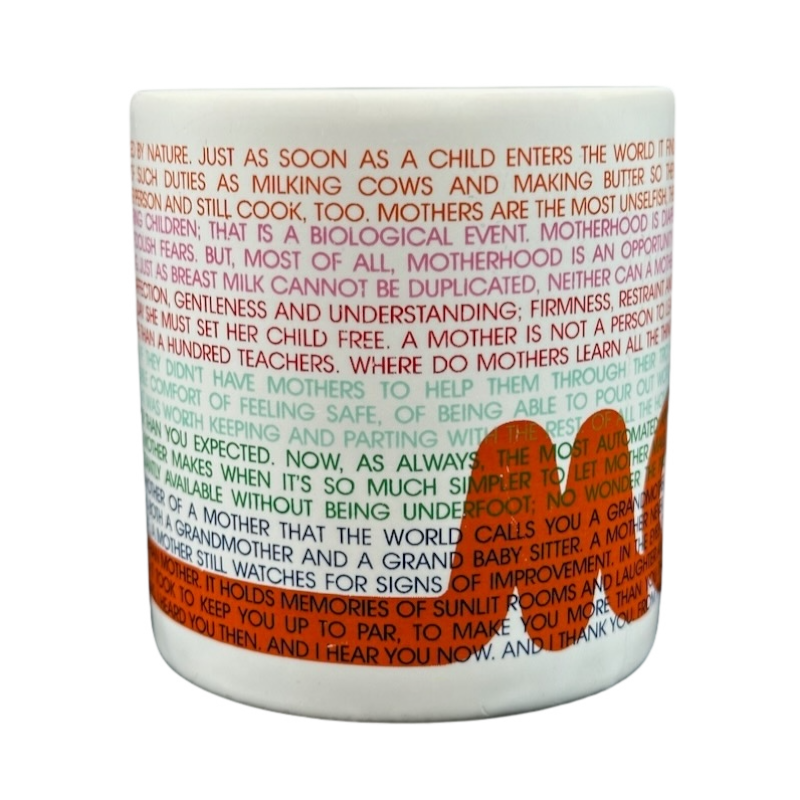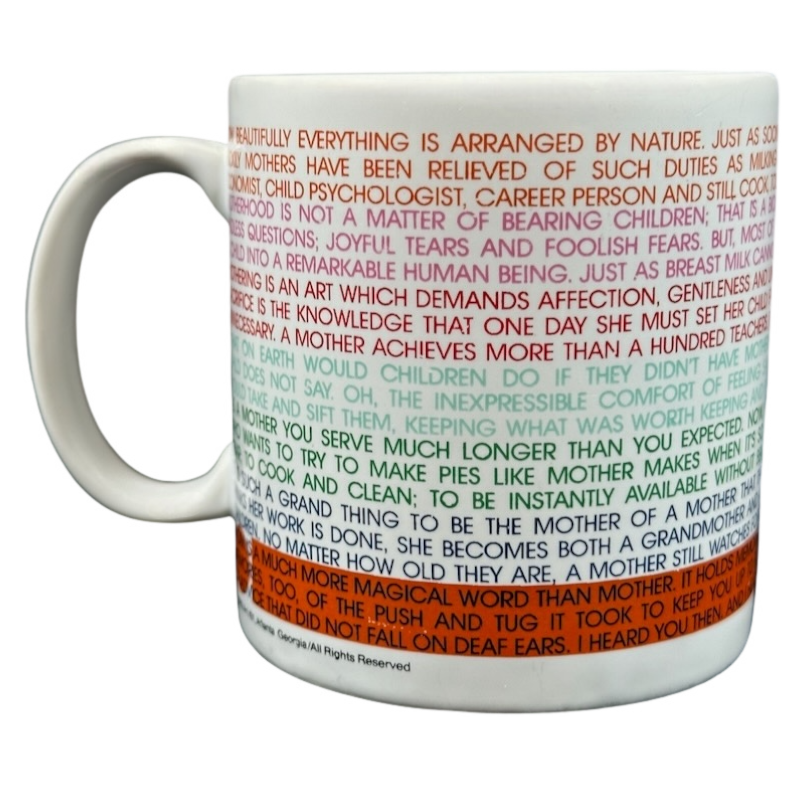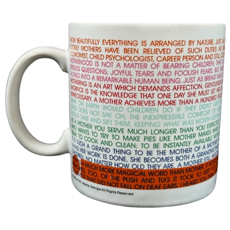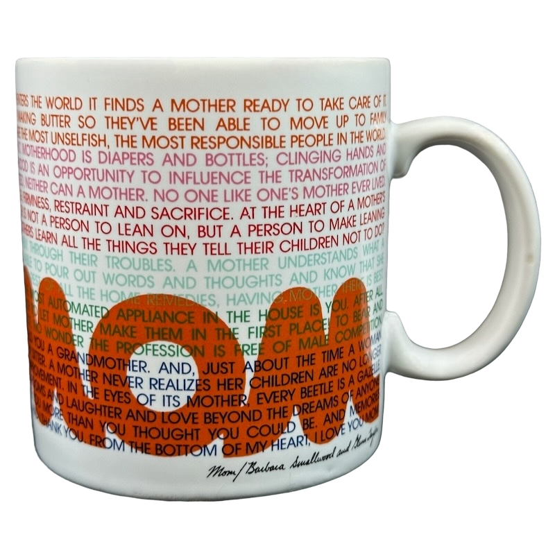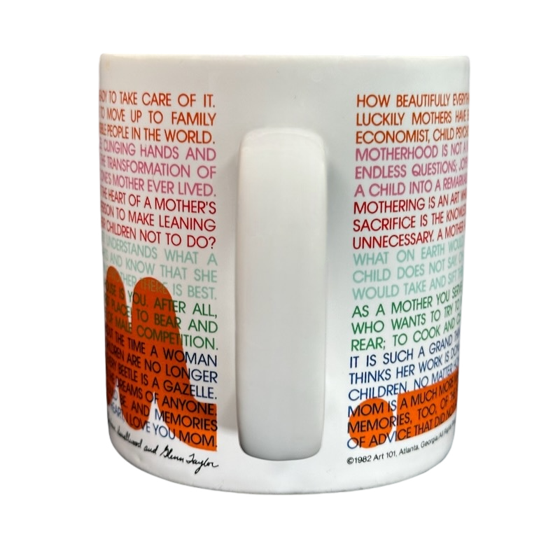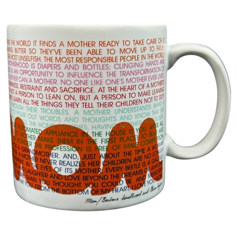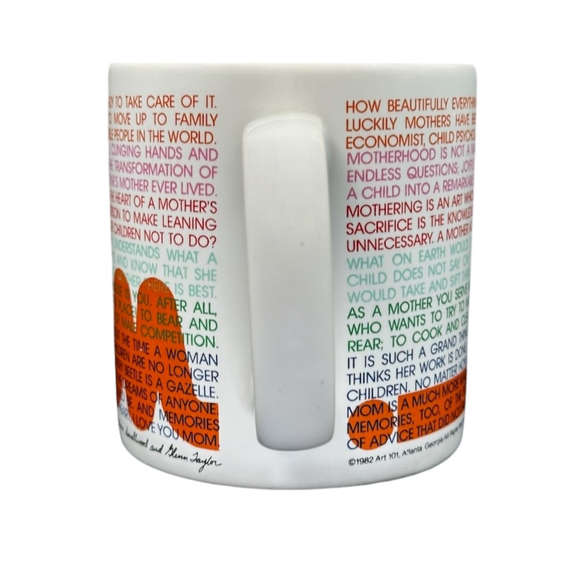 Features artwork wrapping around its exterior surface consisting of words and phrases having to do with being a mom.