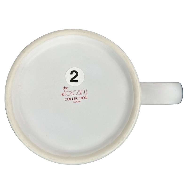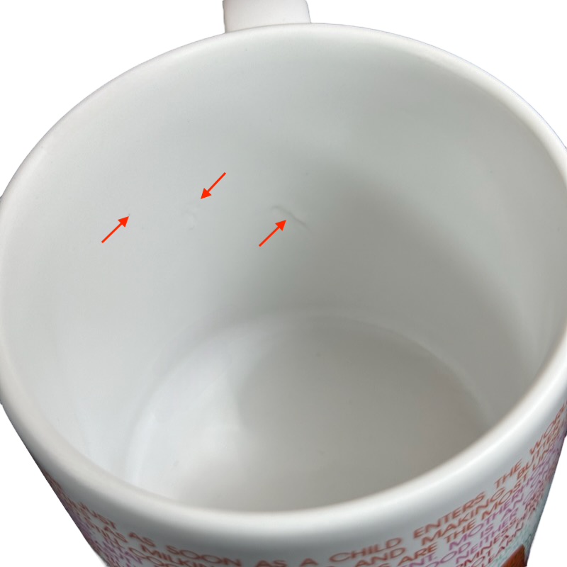 Copy 2: This mug is pre-owned and reconditioned. This mug has no chips, cracks, scratches, stains or crazing. There are a few manufacturing imperfections and a dark dot on the interior wall on the side of the handle, please see the red arrows pointing to these in the last photo.