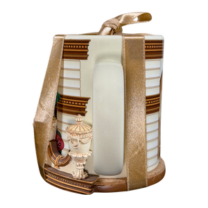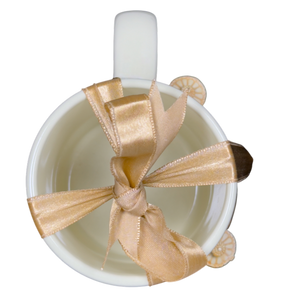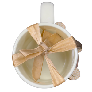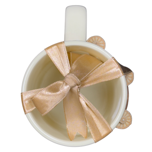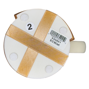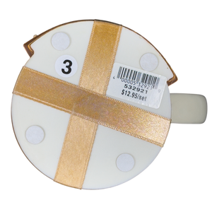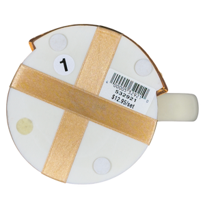 Copy 1: This mug appears unused with its original sticker still on its bottom surface. This mug has no chips, cracks, scratches, stains or crazing. One of the felt dots on the bottom surface is missing. There is some discoloration on the ribbon that holds the coaster and mug together.