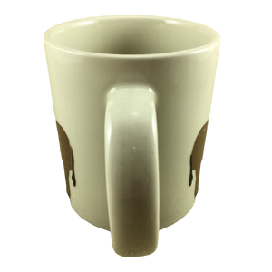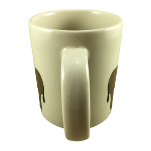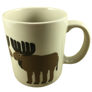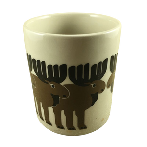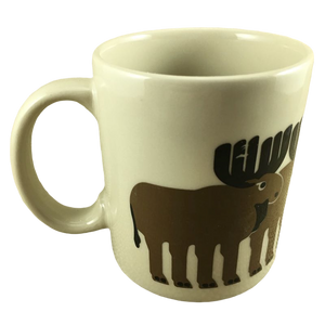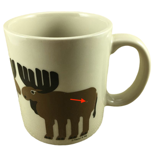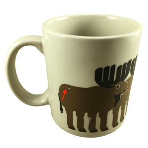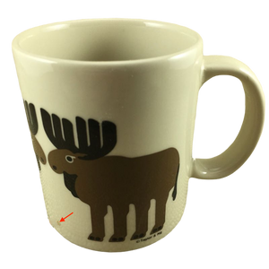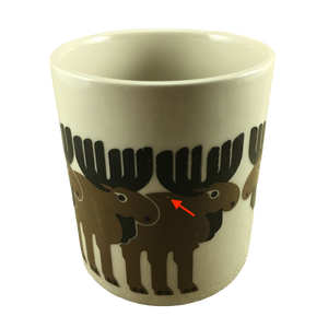 Copy 2: This mug has no chips, cracks, scratches, stains or crazing. There are a few areas on some of the moose where the brown color is missing. Please see the last photo where red arrows point to these areas. There are 2 small dots on the bottom where extra ceramic material is present and raised from the surrounding surface.