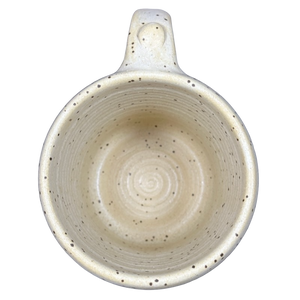 This mug has a speckled appearance on its interior and exterior surface.