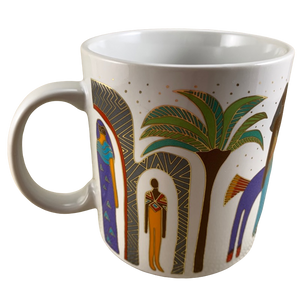 Features beautiful artwork with gold accents wrapping around its exterior surface depicting people, trees, and animals.