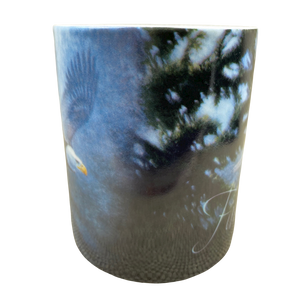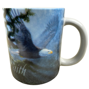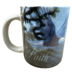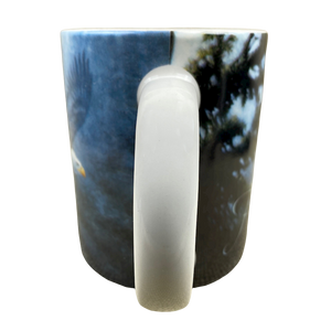 Features the same beautiful painting on its front and rear surface. The painting depicts a bald eagle soaring through the sky with trees behind it.