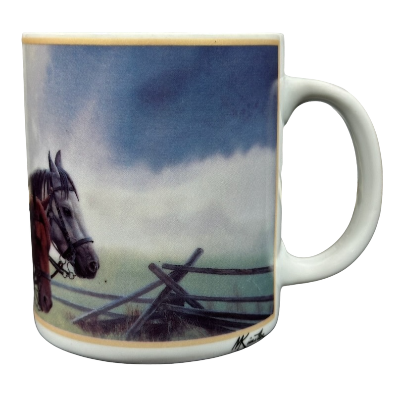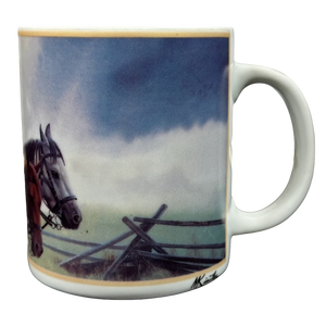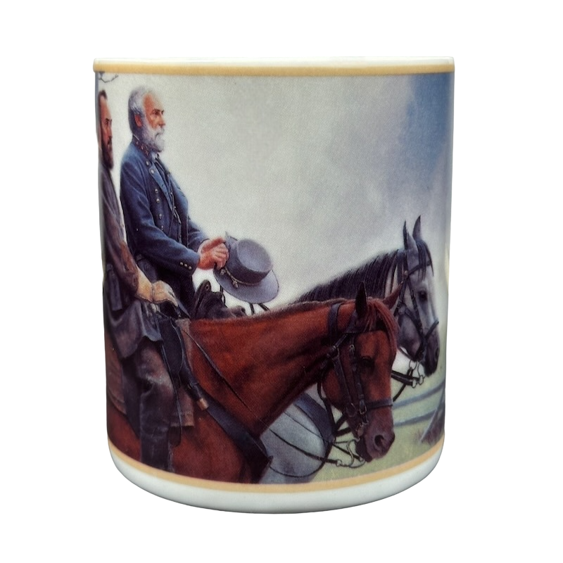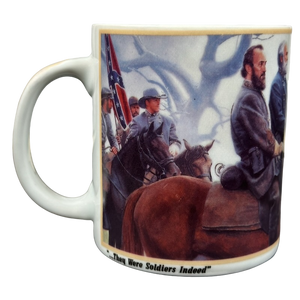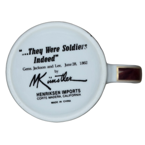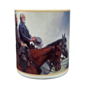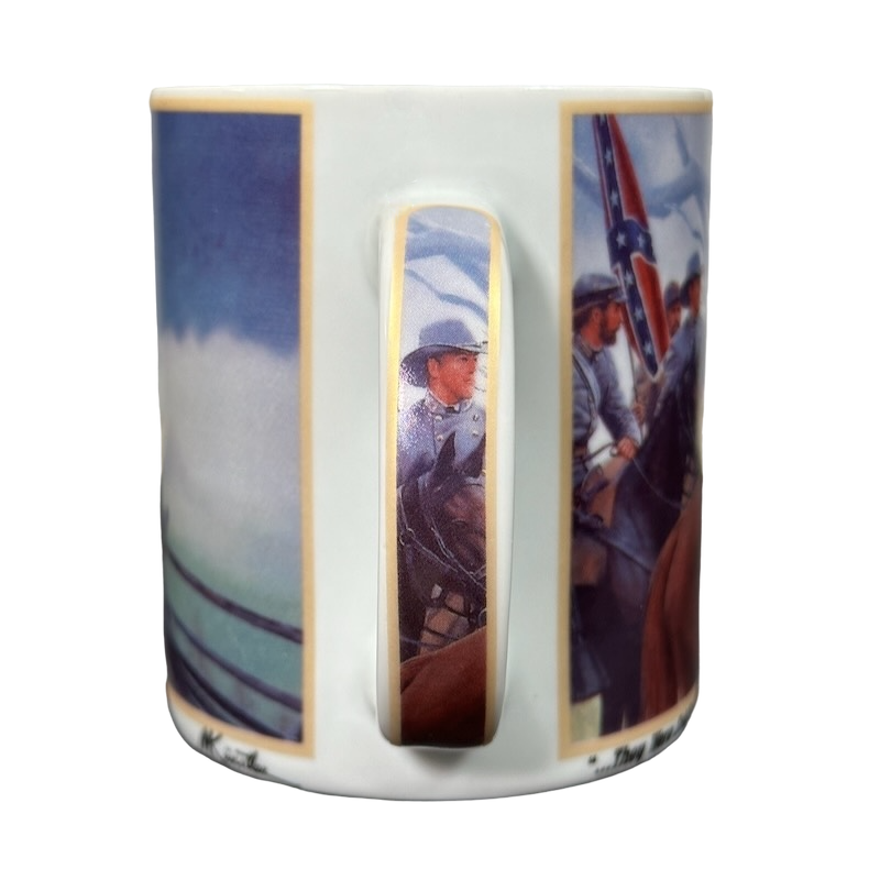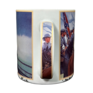 This mug features the painting "They Were Soldiers Indeed" by Mort Kunstler wrapping around its exterior surface and on the handle.