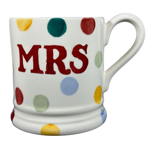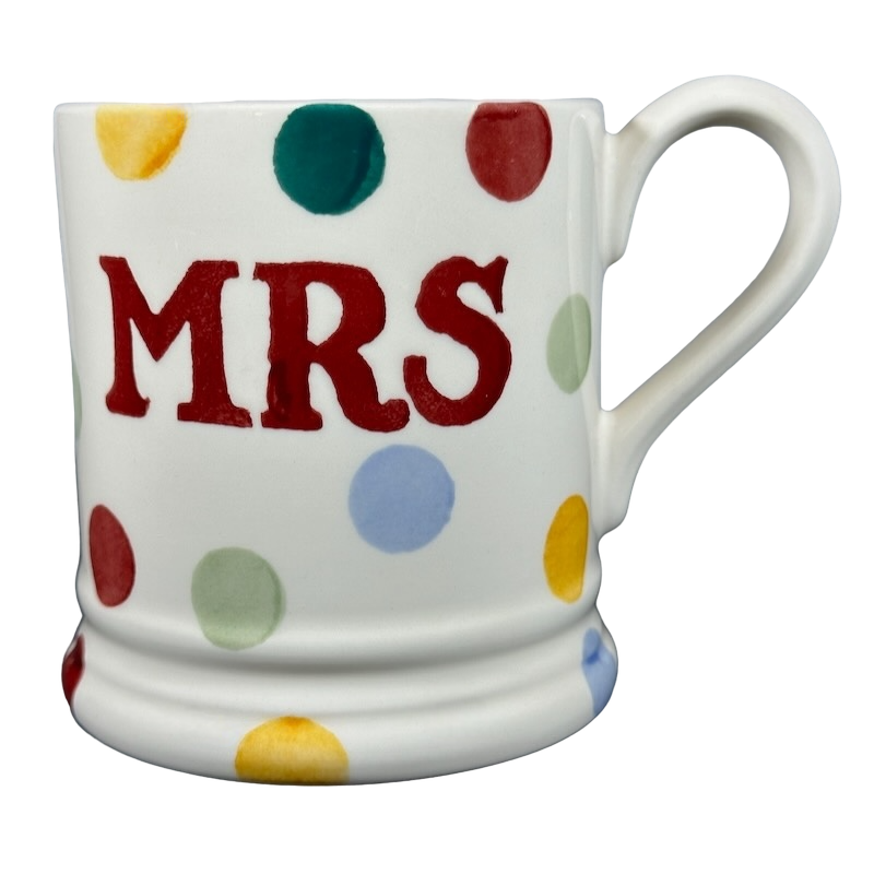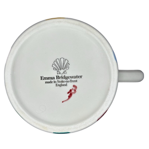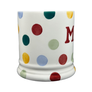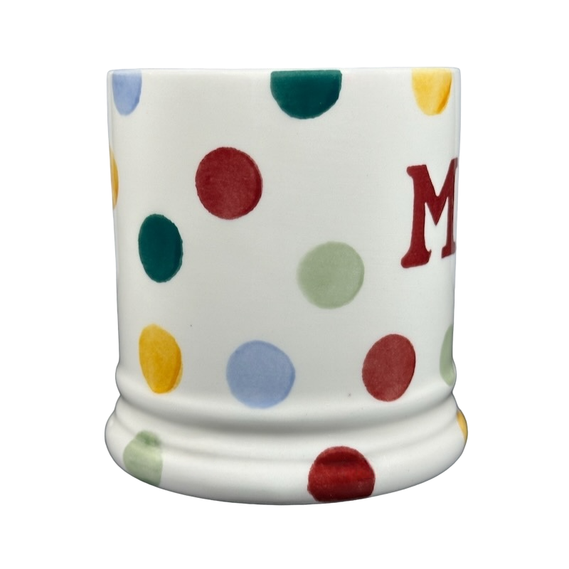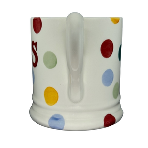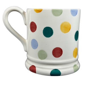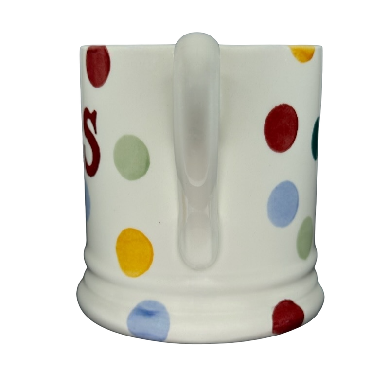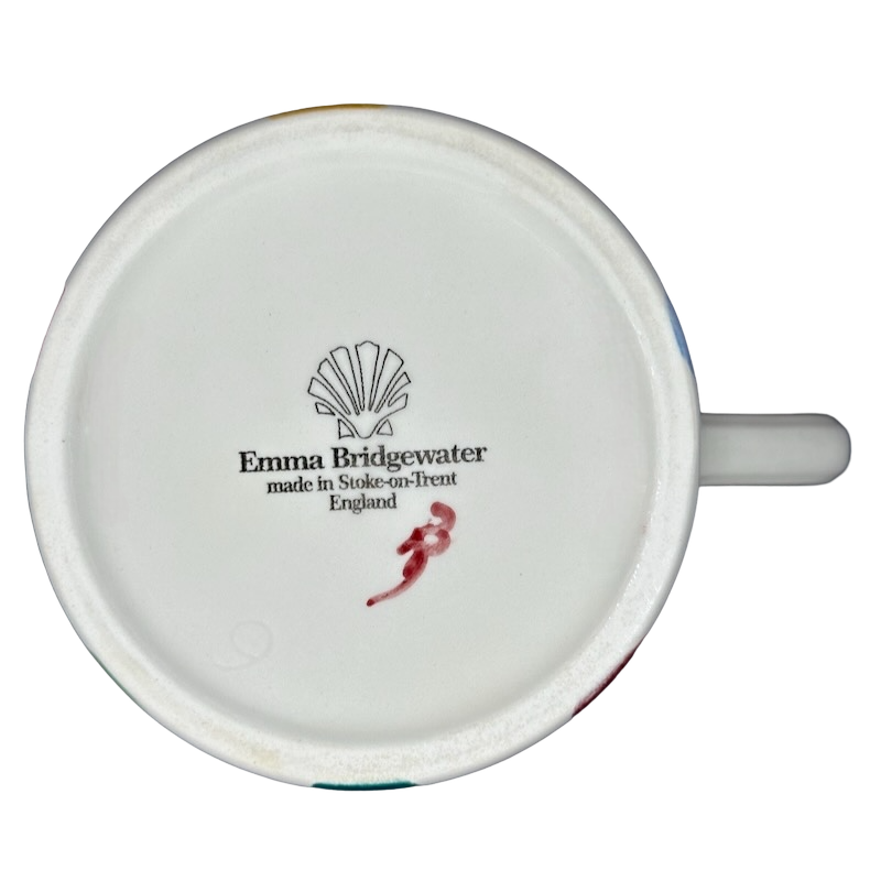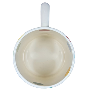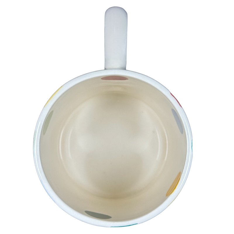 On the interior upper surface under the rim there are five different colored polka dots which match those on the exterior.