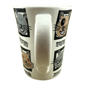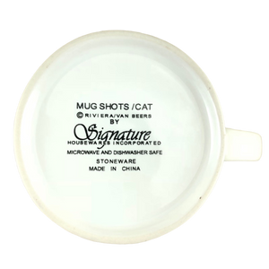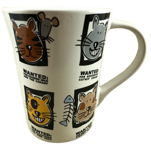 Features humorous artwork wrapping around its exterior surface consisting of mug shots of cats with their crime they committed printed below them.