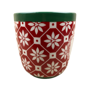 There is a band of green trim wrapping around the exterior surface near the rim and also near the base.